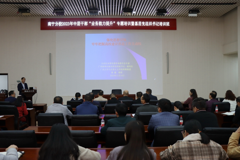 11月16日下午,广西壮族自治区人民政府参事,广西壮族自治区政协委员、广西政协文史和学习委员会副主任黄健教授应邀到太阳集团2138为全体中层干部、基层党组织书记作题为《强化思想引领 牢牢把握高校意识形态工作主动权》专题辅导讲座。太阳集团2138党委书记李雨,太阳集团2138党委副书记梁冬松、唐承泽,太阳集团2138副校长苏欣出席讲座。