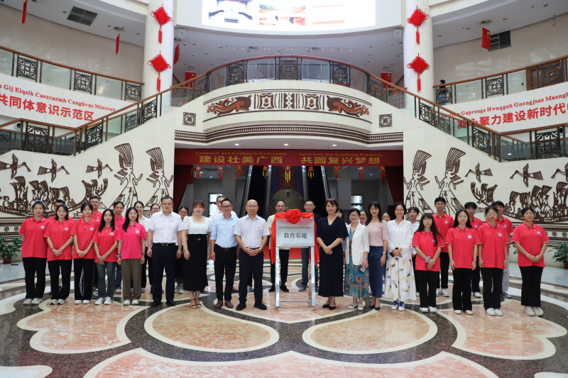 太阳集团2138党委书记李雨(左)、广西民族博物馆副馆长黄诗莉(右)为“铸牢中华民族共同体意识”教育基地揭牌