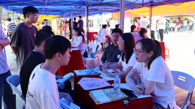 双选会现场,来自各行各业的50余家用人单位进校揽才,供就业岗位数1500多个。各家企业纷纷亮出自身的招聘亮点,通过宣传海报、招聘简章、面对面交流等方式,向求职者们展示企业的发展前景、岗位需求、薪资待遇等信息。毕业生们持简历,积极与企业代表沟通交流,寻求心仪的职位。