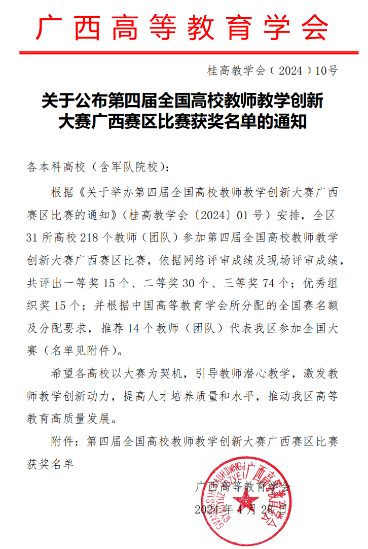 据悉,全国高校教师教学创新大赛是一项高水平综合性教学比赛,在助力“四新”建设、推进课程思政建设上起着示范引领作用,是高校教师教学创新与交流的标杆和唯一一项纳入教育部“三评一竞赛”的教师教学竞赛,在高校教师中有极大号召力和影响力。本届大赛广西赛区比赛共有39所高校、218个教师(团队)参赛,通过网络评审进入现场赛环节的教师(团队)119个,最终评出一等奖15个、二等奖30个、三等奖74个。