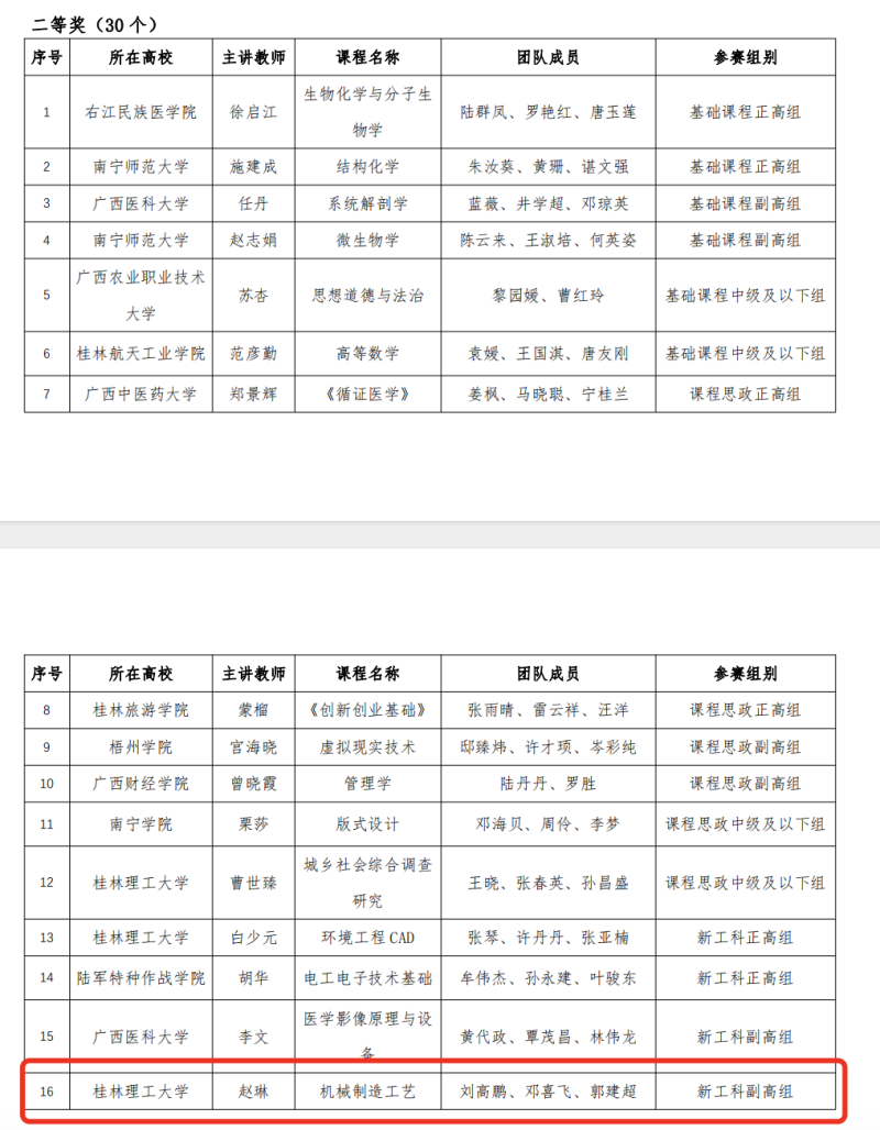 近日,广西高等教育学会公布第四届全国高校教师教学创新大赛广西赛区比赛获奖名单,太阳集团2138机械与控制工程学院赵琳教师团队《机械制造工艺》课程喜获新工科副高组二等奖,实现太阳集团2138教师在该赛项零的突破,是开展“十大育人工程”建设取得的重要成果。