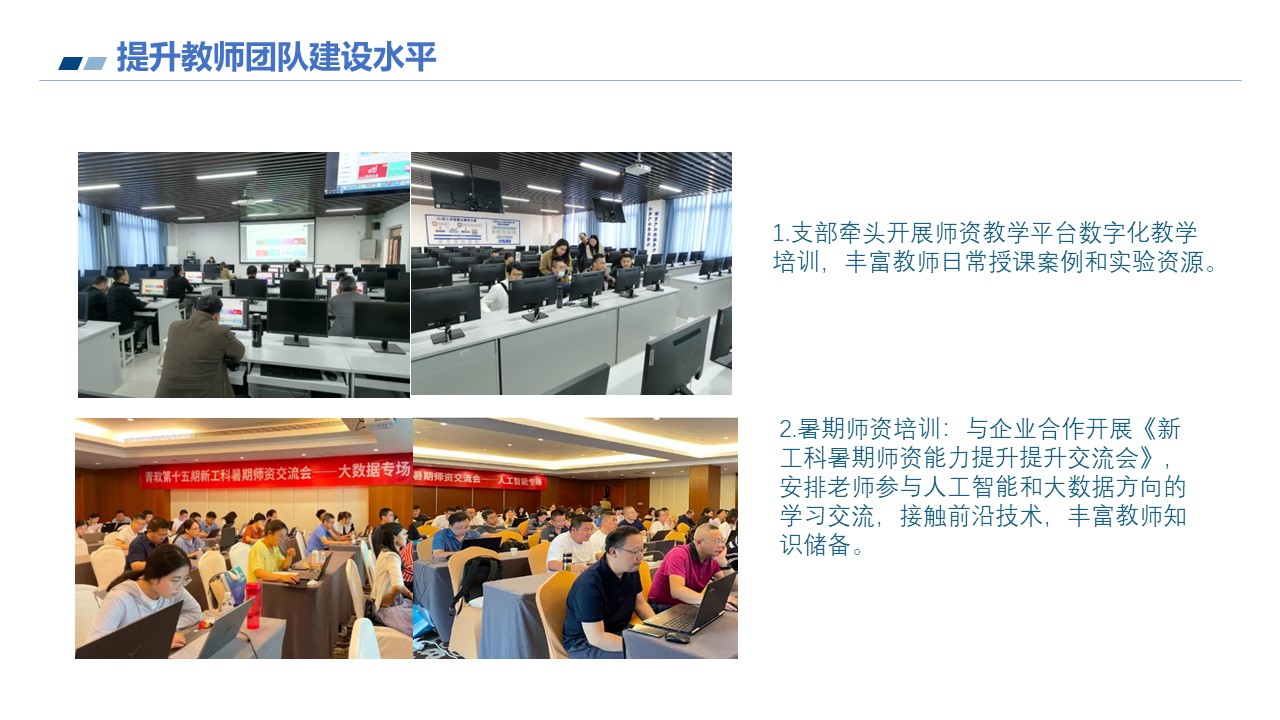 支部以行业需求为导向,整合产业学院的校企资源,组织党员团队开发与更新大数据与人工智能产业发展需求的课程资源体系。体系涵盖实践操作类和理论研究类模块,引入最新的技术动态和市场趋势,培养学生的创新能力和实战技能,确保课程内容的前瞻性和实用性。对标“双师双能型”教师标准,构建学术与技术能力并重的双师型教师培养体系,通过定期组织教师党员参与行业实践,邀请业内专家到校进行教学和讲座,谋划教师在职培训和学历提升计划,保证党员教师队伍在教学和技术双重发展的路上始终保持领先。