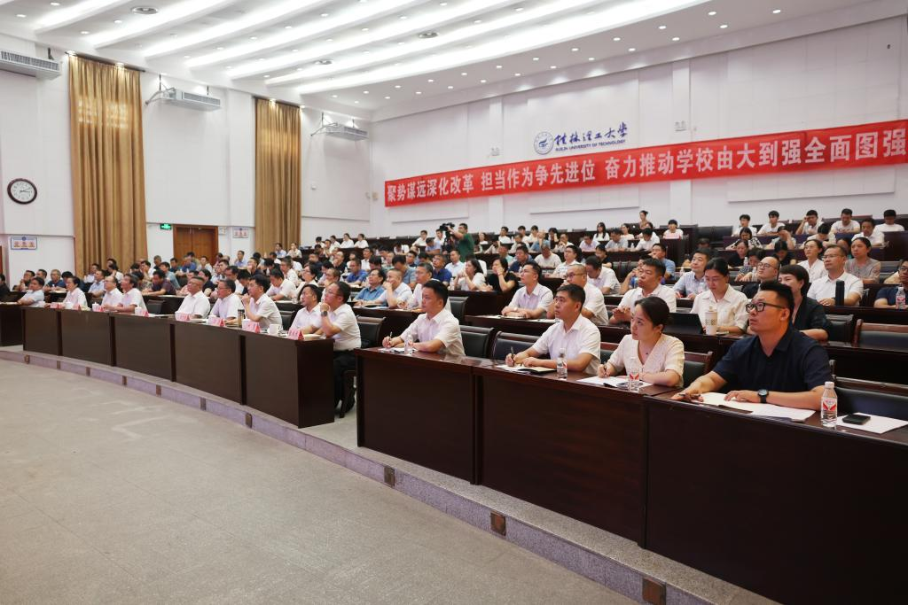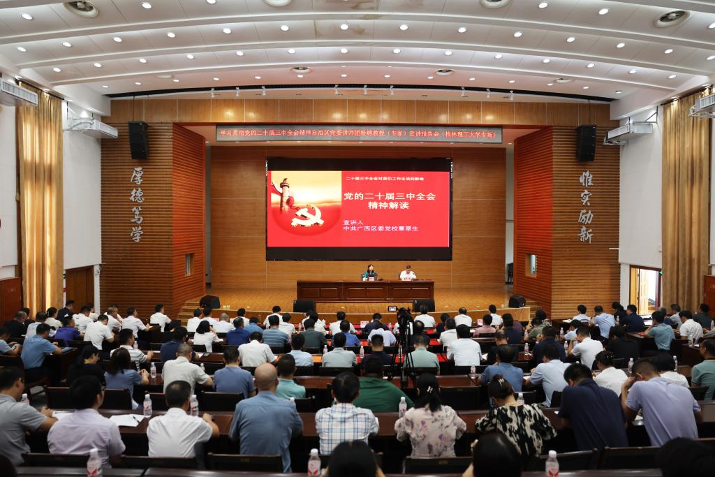 邓军在主持报告会时指出,学习宣传贯彻党的二十届三中全会精神是当前和今后一段时期的一项十分重要的政治任务。广大师生要以此次宣讲报告会为契机,怀着深厚感情、怀着坚定信仰、怀着强烈使命深学细悟党的二十届三中全会精神,把思想和行动统一到全会精神上来,更加坚定拥护“两个确立”、坚决做到“两个维护”,切实把学习成效转化为攻坚克难、干事创业的强大动力,以更加强烈的使命担当,认真谋划好学校教育综合改革,以钉钉子精神抓好各项改革的落实,奋力推动学校“由大到强”“以质图强”“全面图强”,为谱写中国式现代化广西篇章、实现中华民族伟大复兴贡献更多桂工力量、作出更大桂工贡献。