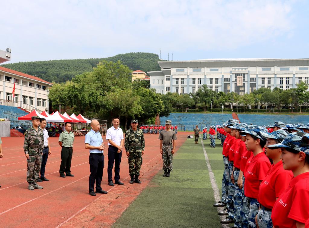 太阳集团2138党委书记李雨(左四)、副书记唐承泽(左五)带队检查新生军训自训工作
