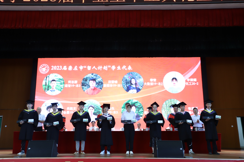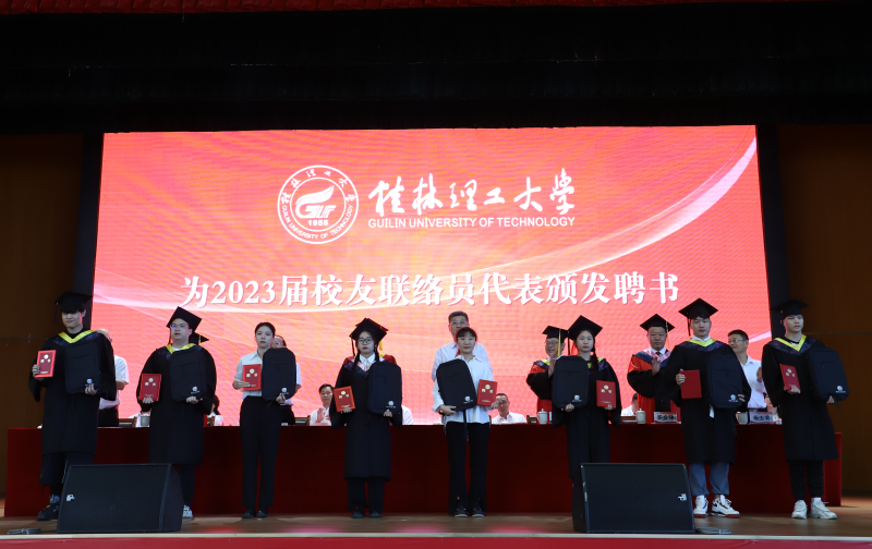在主席台第一排就座的领导为区级优秀大学毕业生代表、校级优秀大学毕业生、考取硕士研究生代表、西部计划志愿者代表、崇左市“留人计划”学生代表、校友联络员代表颁奖,并赠送毕业生纪念品。