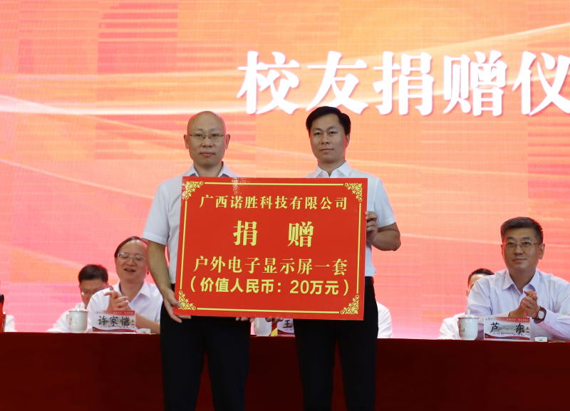 2007级通信专业校友、广西诺胜科技有限公司董事长张镇(右)捐赠户外LED电子显示屏一套