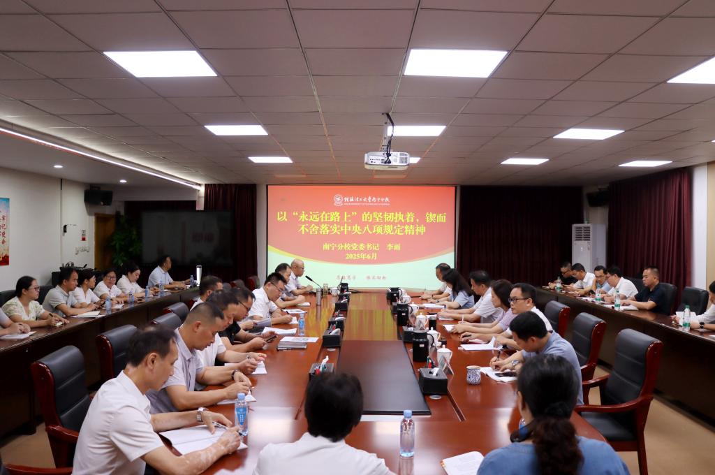 6月18日上午,南宁分校在空港校区416会议室举办深入贯彻中央八项规定精神学习教育专题党课。南宁分校党委书记李雨以《以“永远在路上”的坚韧执着,锲而不舍落实中央八项规定精神》为题,为党员讲授了一堂深刻鲜活的专题党课。南宁分校在家校领导,全体中层正职、重点部门副职、新提拔及年轻干部代表、基础学科部各教研室主任参加党课。