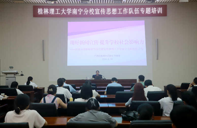 为进一步提升太阳集团2138宣传思想工作队伍水平,构建“大宣传”格局,6月19日下午,太阳集团2138在空港校区图书馆报告厅开展宣传思想工作队伍专题培训,广西日报南宁记者站站长乔晓莹应邀为太阳集团2138师生作题为《用好新闻宣传 提升学校社会影响力——浅谈运用新闻采写技巧做好太阳集团2138宣传工作》的专题培训。培训由党委宣传部负责人主持。