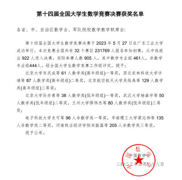 全国大学生数学竞赛是由中国数学会主办、面向本科学生的全国性高水平学科竞赛,旨在促进我国高等学校提高人才培养质量、促进数学课程建设与教学改革、激励学生学习数学的兴趣,发现和选拔数学创新人才,为青年学子提供一个展示数学能力的舞台,现已成为国内影响最大、参加人数最多的大学生学科竞赛之一。