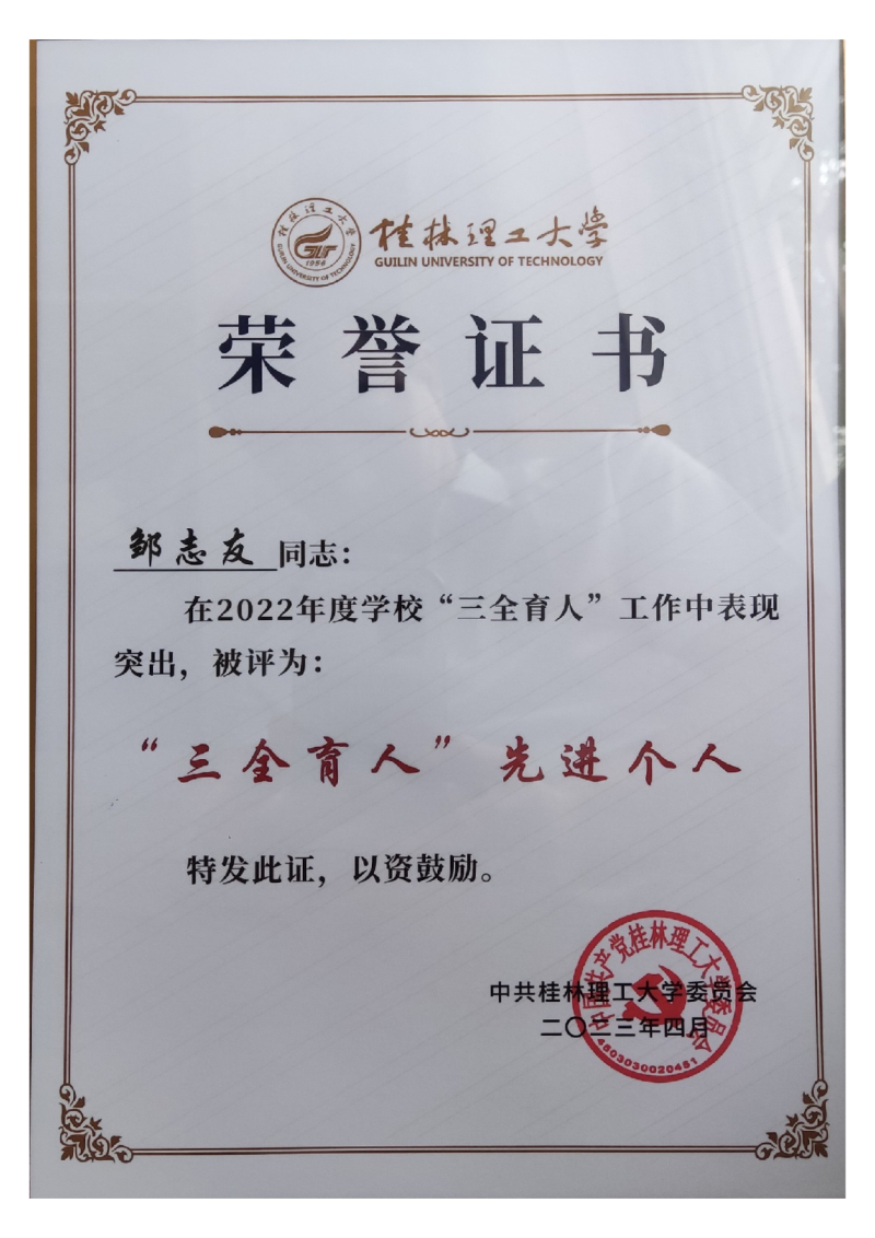 4月27日,太阳集团2138在屏风校区图书馆报告厅召开学校“三全育人”综合改革工作推进会,会议表彰了学校“三全育人”先进集体和先进个人,太阳集团2138邹志友同志荣获太阳集团2138“三全育人”先进个人荣誉称号。