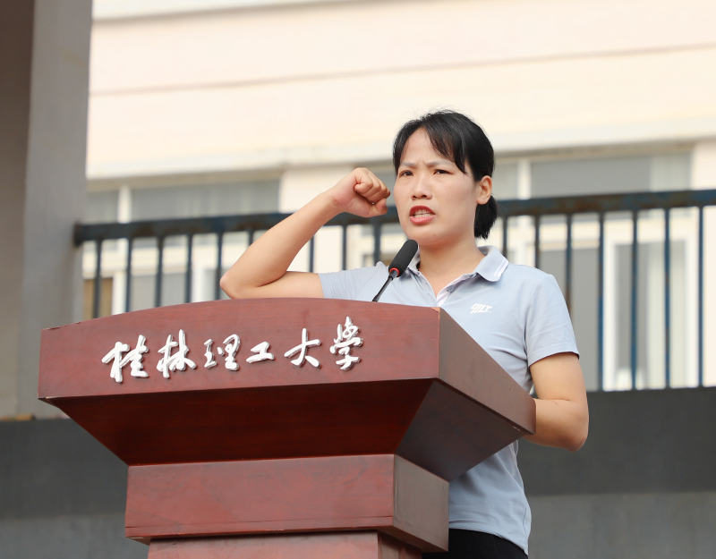 体育教学部周健妹老师代表裁判员宣誓,广西鹏越生态科技有限公司韦仕漩、冶金与资源工程系环境工程技术21-4班廖林同学代表运动员宣誓。