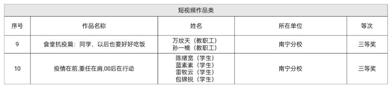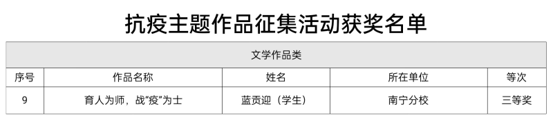 在太阳集团2138各单位(部门)积极动员下,广大师生踊跃参与,紧扣抗疫主题,构思新颖,利用抗疫防疫期间的所见所闻,不断收集素材,对相关资料进行整理、设计,通过创作描述出太阳集团2138抗疫防疫的每个瞬间,涌现了不少意义深刻的作品。在所提交的中,蓝贡迎同学的作品《育人为师,战“疫”为士》荣获文学作品类三等奖;万纹天、孙一楠老师的作品《食堂抗疫篇:同学以后也要好好吃饭》,陈绪宽、蓝素素、雷牧云、包锦锐同学的作品《疫情在前,重任在肩,00后再行动》分别荣获短视频作品类三等奖。