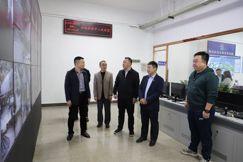 学校党委常委、副校长邓国彬(右二)在空港校区安防指挥中心检查设备升级改造情况