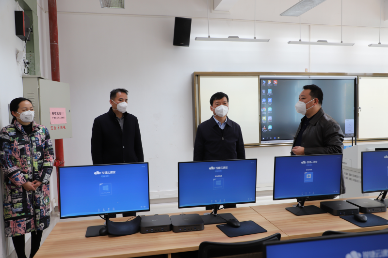 学校校长解庆林(右二)在实训楼调研教育信息化建设项目(一期)机房调研