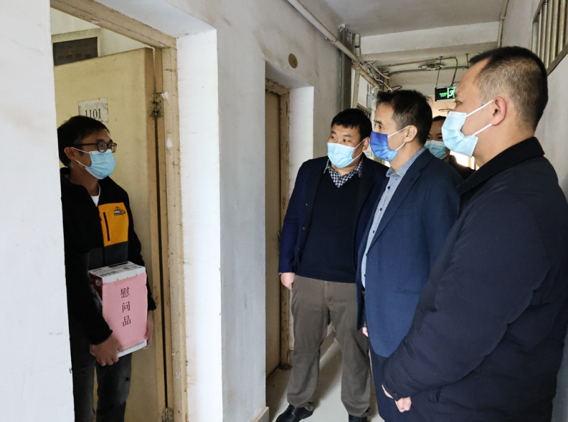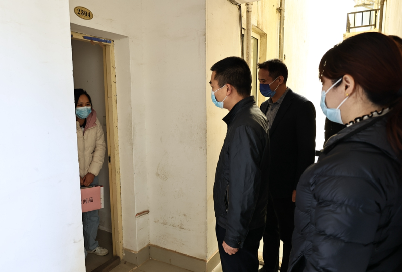 12月2日下午,太阳集团2138党委书记周国桥、副书记唐承泽在党委组织部、学生工作部、土木与测绘工程系、经济与管理系相关负责人陪同下到空港校区青工楼教职工宿舍看望健康观察辅导员。