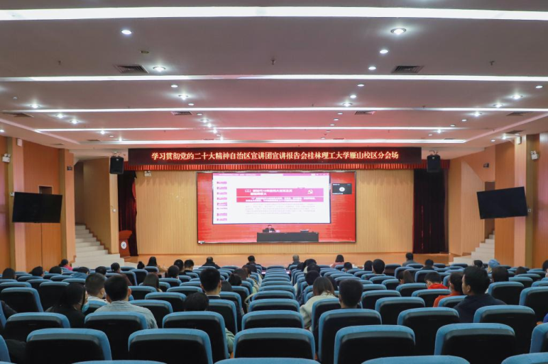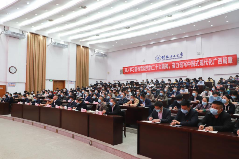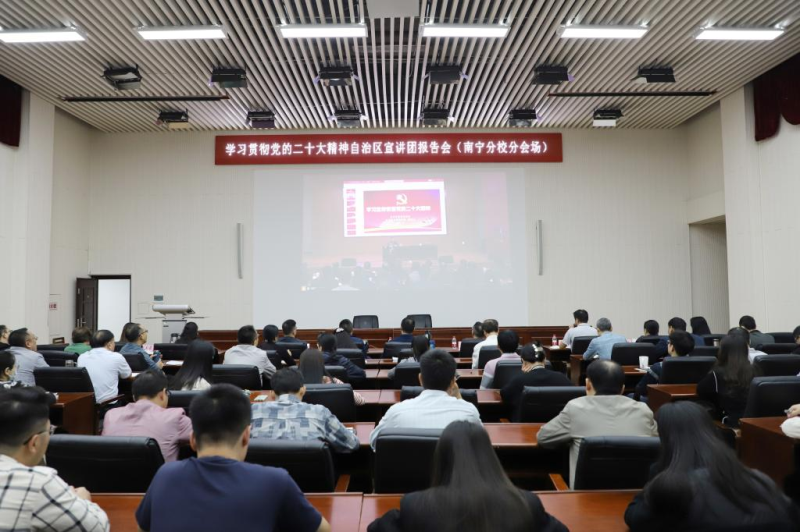 11月16日上午,学习贯彻党的二十大精神自治区宣讲团宣讲报告会在我校举行。自治区宣讲团成员、自治区党委组织部副部长曾凯作宣讲报告。报告会由我校党委书记邓军主持。学校校长解庆林,副校长王玫、周国清、梁福沛、王敦球、邓国彬,总会计师曾繁荣,党委常委、组织部部长唐壮东、宣传部部长叶昊、统战部部长邱杰,党委委员、校长助理辛立章、罗盛锋出席报告会。学校全体处级干部、机关干部、思想政治理论课教师、辅导员,教师代表、学生代表约1300人在主、分会场参加报告会。