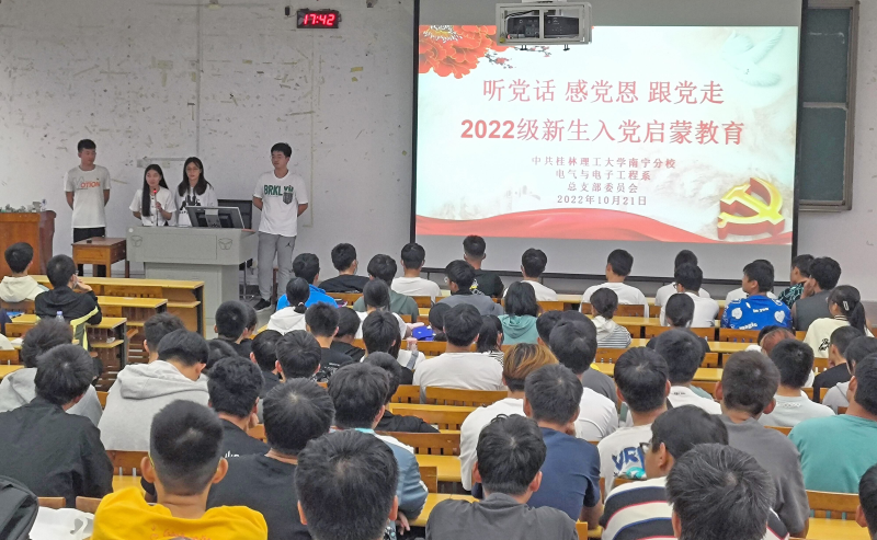 紧抓新生教育“关键期”,以党员教育活动中心为教育平台,发挥宣传教育阵地优势,成立新生入党启蒙教育宣讲团,分别从党的光辉历程、党的自身建设、高校党建、桂工党建等方面组织开展宣讲,通过集中教学的方式,100%覆盖2022级4070名新生,加强新生对中国共产党的认识,帮助青年学子知党、信党、入党。