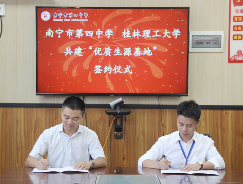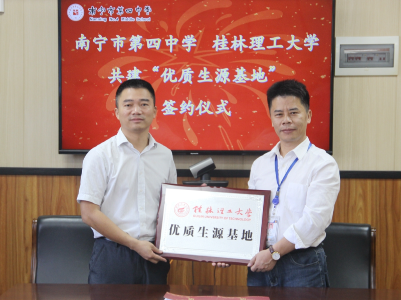 会后,双方共同签署《太阳集团2138优质生源基地协议书》。周国桥书记代表学校向广西南宁市第四中学颁发“太阳集团2138优质生源基地”牌匾。