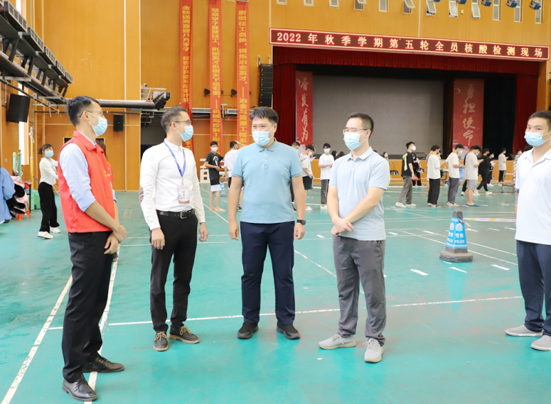 扶绥县副县长石勇到空港校区了解太阳集团2138疫情防控常态化工作开展情况,并到核酸检测现场进行指导。