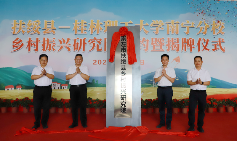 邓军(左二)、吴志强(左一)、黄建辉(右二)、谢添(右一)共同为崇左市扶绥县乡村振兴研究院揭牌