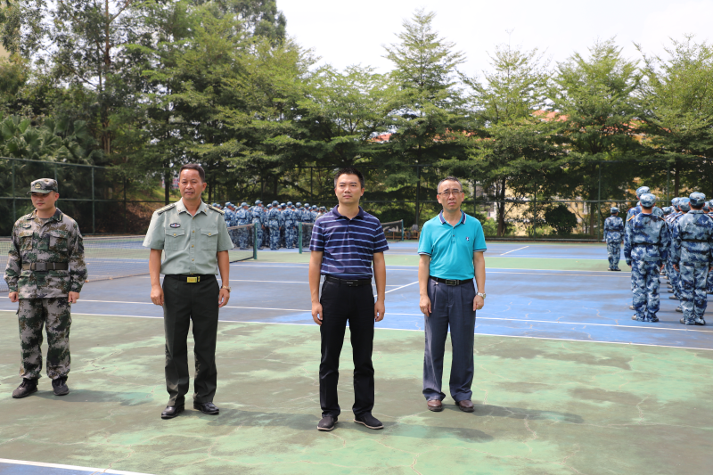 太阳集团2138党委书记周国桥(前排右二)、副书记梁冬松(前排右一)带队检查新生军训自训工作