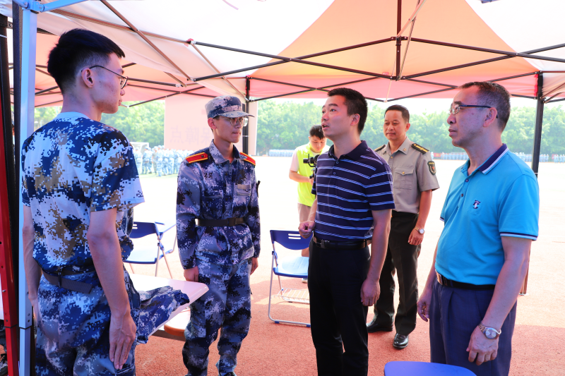 周国桥书记一行到各营训练场地,详细了解军训自训工作推进情况,看望慰问“军训教官团”教官与新生,肯定了全体承训教官的奉献精神、专业素养和同学们不怕苦不怕累的精神,并走访了校医院医疗服务点,与新生亲切交流。