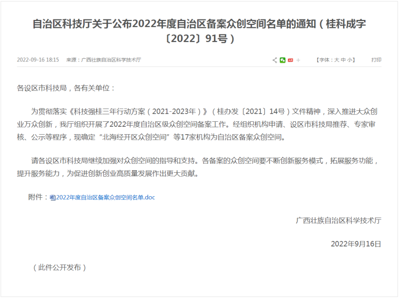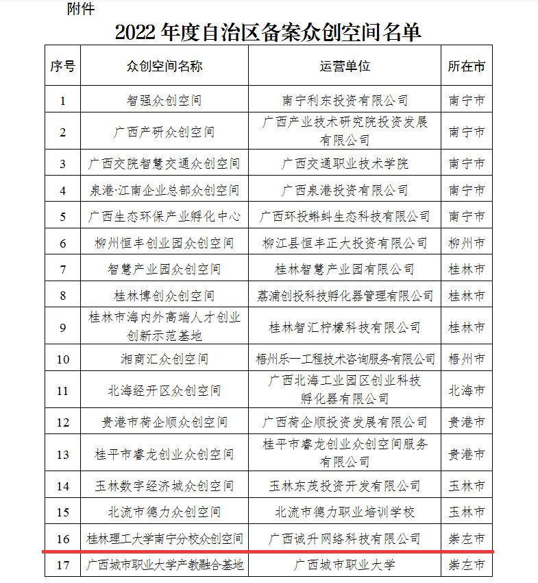 近日,广西科技厅发布《自治区科技厅关于公布2022年度自治区备案众创空间名单的通知》(桂科成字〔2022〕91号)文件,太阳集团2138众创空间成功入选,这是太阳集团2138的首家区级众创空间,是太阳集团2138近年来创新创业教育改革取得的又一丰硕成果。