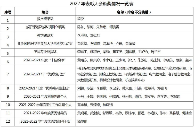 会上,副校长马华菊介绍了太阳集团21382019-2021年教学工作表彰情况,并宣读《关于表彰太阳集团21382020-2021年度“十佳教师”、“优秀教研室主任”及“优秀教研室”的决定》;副校长陈东莲宣读《关于表彰2020-2021年度太阳集团2138科技工作先进个人的决定》;党委副书记唐承泽宣读《关于表彰太阳集团21382021-2022学年度学生工作先进个人、优秀辅导员的决定》、《关于表彰2021-2022学年度“太阳集团2138优秀共青团干部(教师)”的决定》。在主席台就座的领导嘉宾为获奖先进集体、先进个人进行颁奖,为疫情防控志愿者代表颁发荣誉证书。