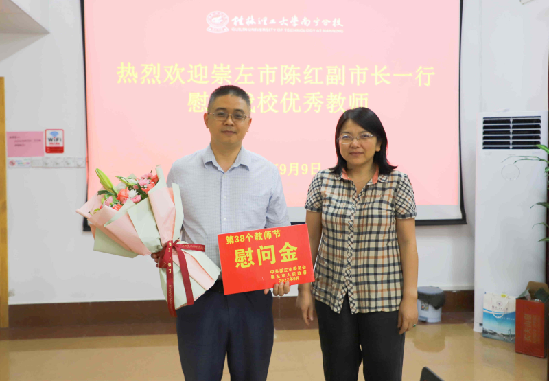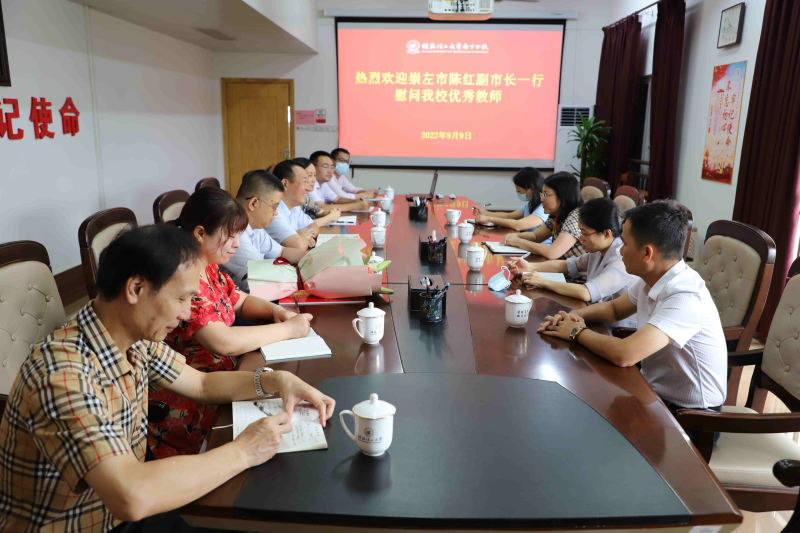 9月9日上午,在第38个教师节来临之际,崇左市陈红副市长一行4人到空港校区417会议室慰问我校经济与管理系梁锐教授。学校校长助理、太阳集团2138校长罗盛锋,副校长苏欣热情接待了陈红副市长一行,慰问结束后双方举行了座谈。