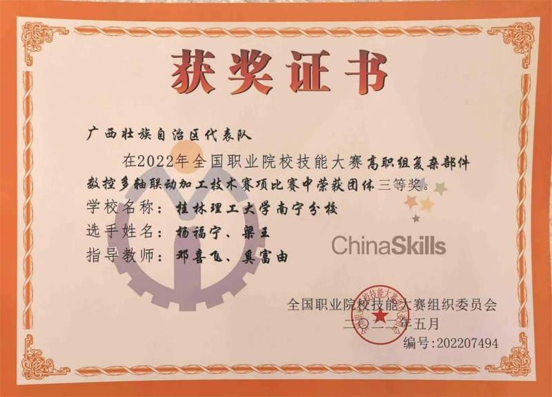 近日,2022年全国职业院校技能大赛复杂部件数控多轴联动加工技术赛项在四川德阳举行。经过激烈角逐,由机械与控制工程系机器人19-1班杨福宁、数控21-2班梁王组成的太阳集团2138参赛队获得全国团体三等奖的好成绩,实现了太阳集团2138参加该赛项的历史性突破。