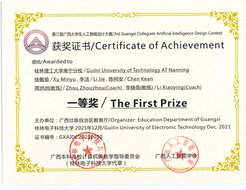 荣获第三届广西大学生人工智能设计大赛一等奖