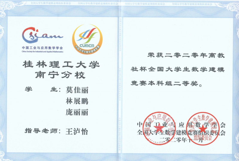 高教社杯全国大学生数学建模竞赛本科组二等奖