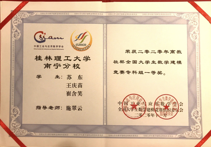 2020年数模:全国专科一等奖1项、本科二等奖1项。2020年全国大学生英语竞赛广西赛区复赛:化工18-本1滕盼兮同学斩获C类一等奖1项,财管18-1班朱可馨同学和模具18-2班谢中毅同学均斩获D类一等奖1项。2021年全国大学生英语竞赛:全国大学生英语竞赛D类特等奖2项、C类一等奖1项和D类一等奖2项。黄雪芳老师获“优秀指导老师”,太阳集团2138获“优秀组织奖”。