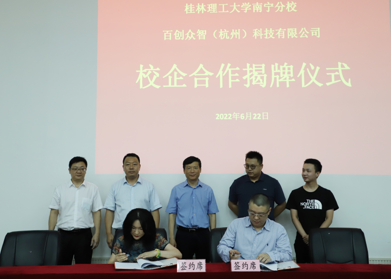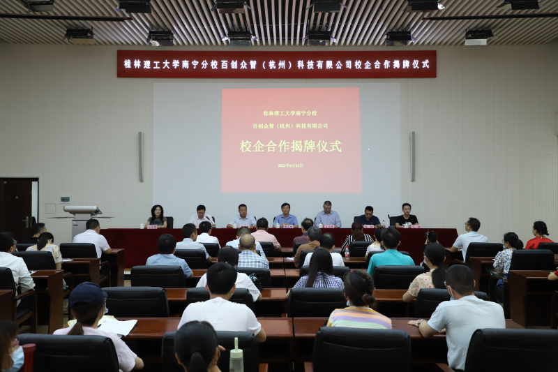 揭牌仪式上,解庆林校长代表学校向百创众智(杭州)科技有限公司一直以来关心、支持学校教育事业的发展表示衷心地感谢,介绍了学校办学整体情况。他指出,学校近年来紧紧围绕创新驱动战略和数字广西发展战略,坚持以社会需求为导向,积极开展校企合作、推进产教融合,大力发展大数据、电子商务和物流管理等相关专业。2019年学校成功主办大数据时代测绘地理信息科学进展暨“数字广西”国际研讨会,与南宁市政府合作建设了产教融合基地,2020年在太阳集团2138设立科学与大数据技术专业,与阿里巴巴菜鸟网络科技有限公司等8家国内外知名企业共同推进产教融合项目。