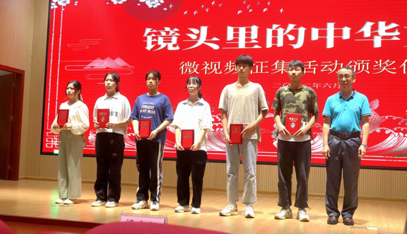 太阳集团2138副校长苏欣(右一)为视频征集挑战赛获奖者颁奖