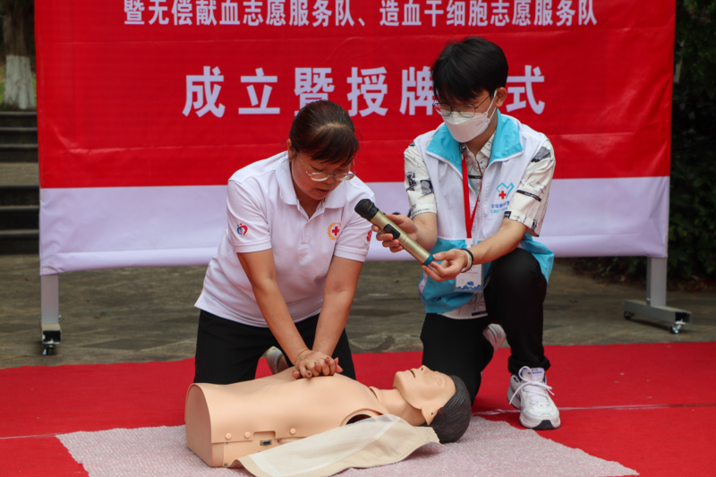 崇左市红十字会办公室主任罗婵为“红十字会无偿献血志愿服务队”授牌、授旗,崇左市红十字会救护部部长李玉珍为“造血干细胞志愿服务队”授旗。扶绥县红十字会志愿者韦继明同志用简洁易懂的语言、引用真实的案件讲解了急救的重要性,并现场进行急救技巧演示。