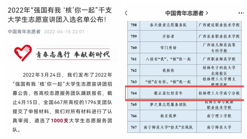 据悉,截止2022年4月,全国667所高校的1796支团队提交了申报材料,承办方对所有材料进行了认真审阅,遴选了1000支大学生志愿服务团队,广西壮族自治区共26支队伍入围。