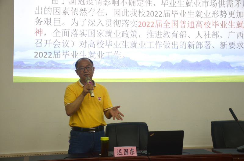 培训会上,迟国东副处长分析了当前全国高校毕业生就业总体形势,并就国家、自治区出台的关于高校毕业生就业工作相关政策文件进行解读,重点分析了当前校园招聘的痛点和趋势,围绕如何做到“学生满意、雇主满意、家长满意、社会满意、学校满意”五个“满意”的就业工作愿景,提出了做好校园招聘的策略。迟国东副处长还对学校毕业生就业工作考评标准和2022届毕业生就业工作日程安排进行了解读。