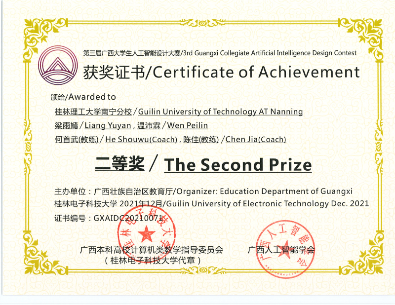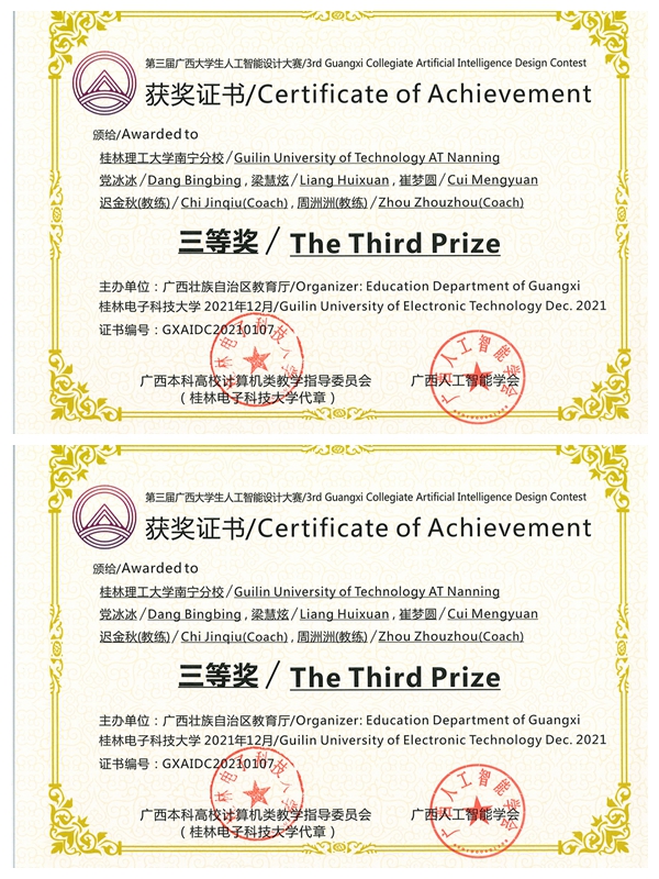 近日,由广西区教育厅主办,桂林电子科技大学等7所高校承办的第三届广西大学生人工智能设计大赛圆满落幕。太阳集团2138学子凭借扎实的专业素养,从全区38所高校的764支参赛队伍中脱颖而出,在第四赛道“AI智能推荐与深度学习”赛项中,太阳集团2138代表队荣获一等奖1项,二等奖1项,三等奖2项,计算机应用系周洲洲、李晓英2名教师荣获“优秀指导老师”称号。