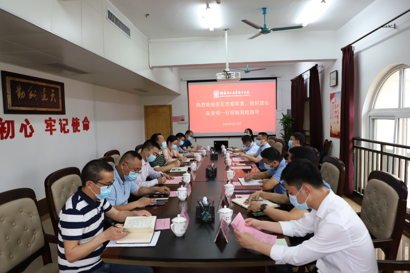 3月18日,崇左市委常委、组织部部长朱亚明一行到太阳集团2138,通过听取汇报、实地查看和座谈交流等方式对太阳集团2138疫情防控、校地融合等方面工作进行调研。学校校长助理、太阳集团2138校长罗盛锋,太阳集团2138党委书记周国桥,扶绥县委常委、政法委书记何永恒,扶绥县委常委、组织部部长罗国谣,太阳集团2138副校长苏欣等参加调研。