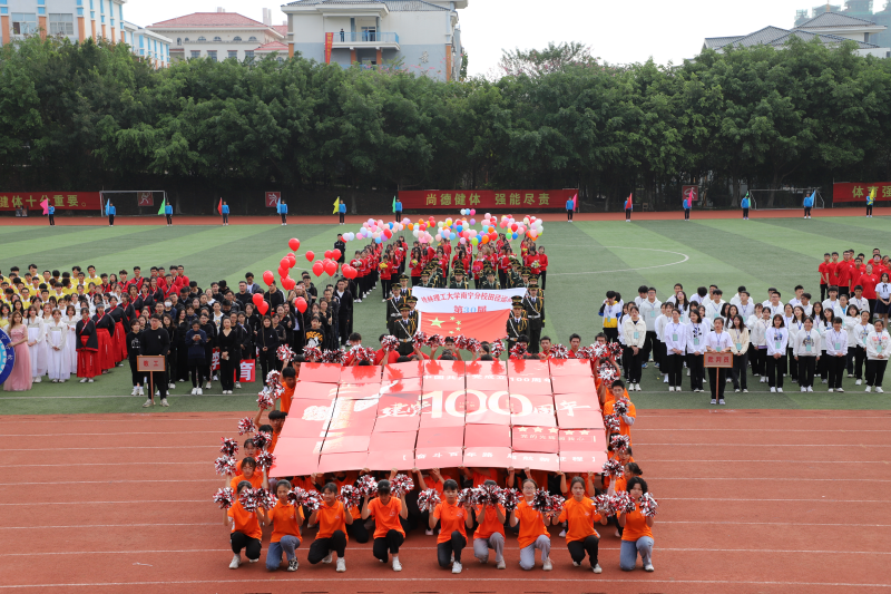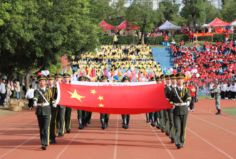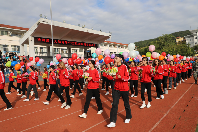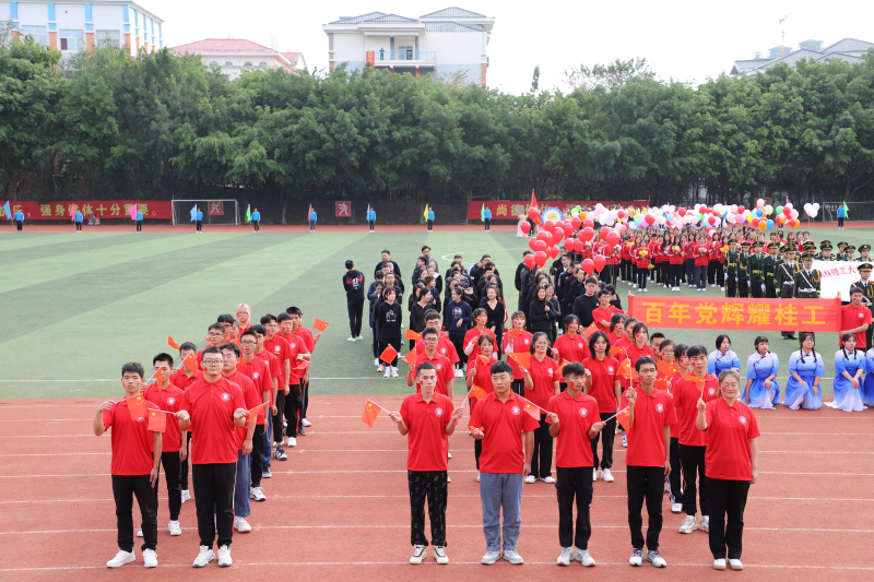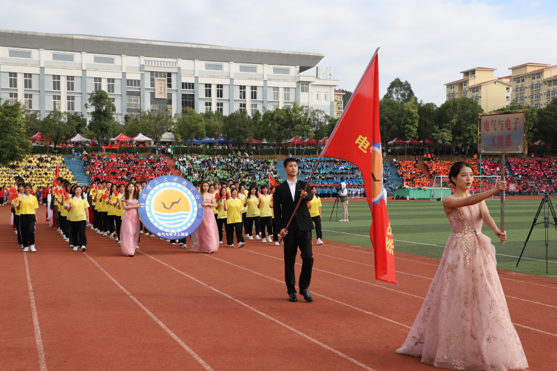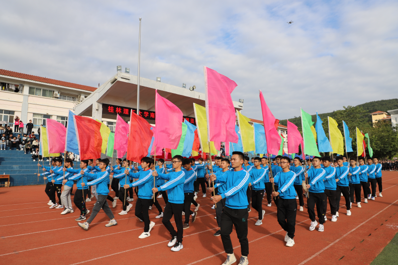 在激昂的运动员进行曲中,校国旗队队员们护送鲜艳的五星红旗、校运会会旗、会徽进入会场,为入场式揭开帷幕。鲜花队和彩旗队紧随其后,队员们挥舞着手中的彩旗和鲜花,喊着嘹亮的口号,为运动员喝彩。裁判员、教工方阵和各系运动员方阵迈着整齐划一的步伐陆续进入会场,他们精神抖擞、英姿焕发,展现出了桂工新时代青年的靓丽青春风采。随后,全体人员在嘹亮的中华人民共和国国歌声中举行升旗仪式。