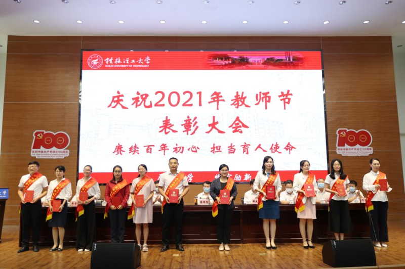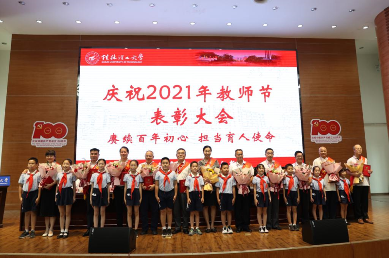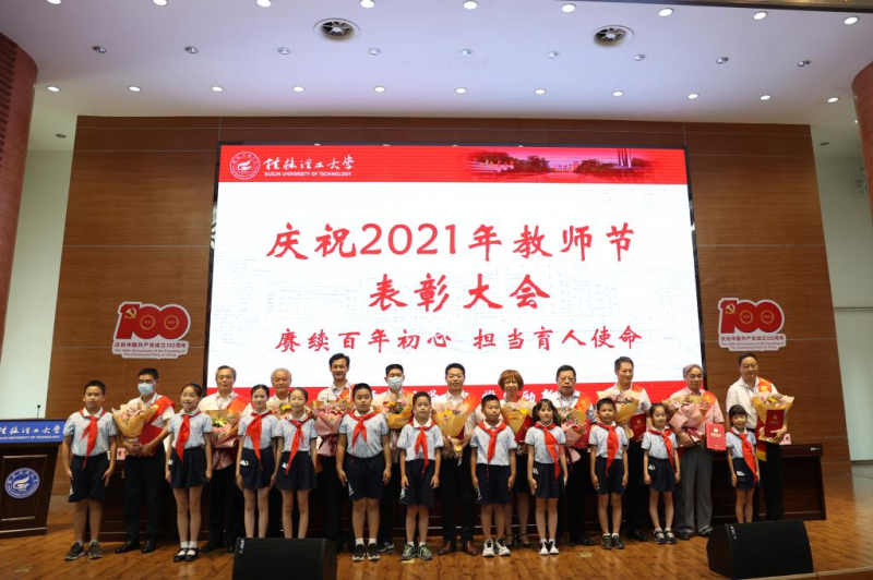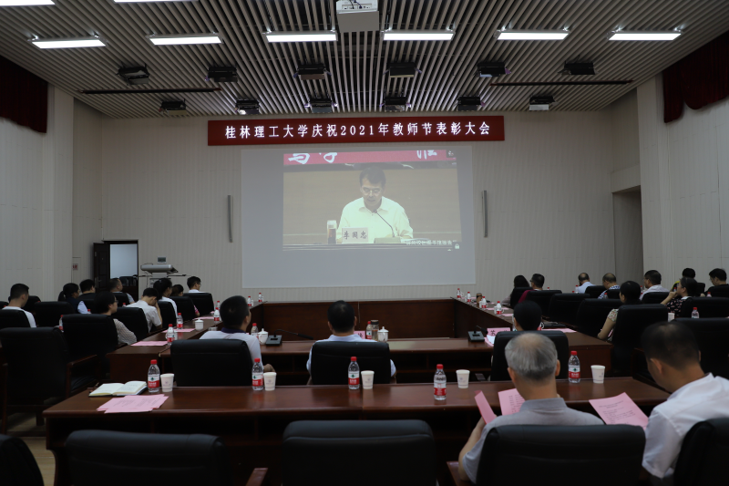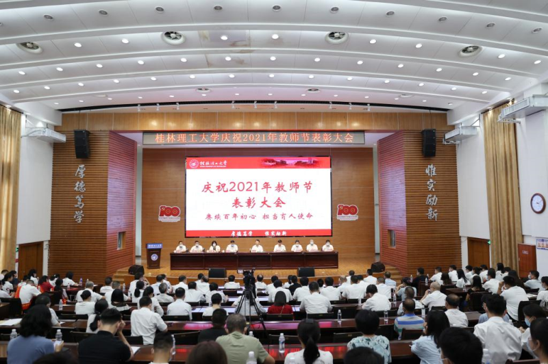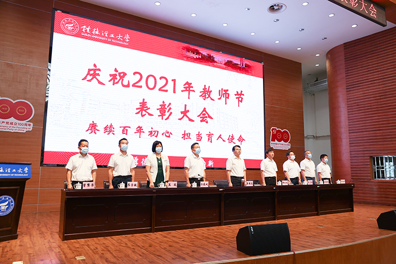 为深入学习贯彻习近平总书记“七一”重要讲话精神,激励广大教职工铭记百年党史,弘扬伟大建党精神,切实担当为党育人、为国育才的光荣使命,9月8日下午,学校在屏风校区图书馆报告厅召开庆祝2021年教师节表彰大会,并在太阳集团2138设视频分会场。在家校领导李国忠、解庆林、齐俊斌、吴志强、王玫、王敦球、韦学敏、邓国彬、曾繁荣出席会议。各单位、各部门党政主要负责人,获奖个人、“从教三十年”教师代表、师生员工代表参加会议。大会在庄严的国歌声中拉开帷幕。