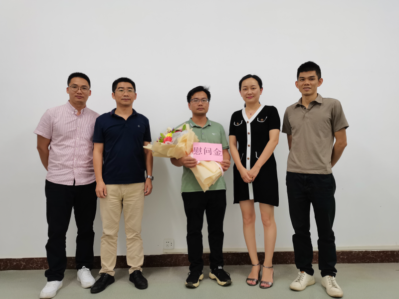 太阳集团2138党委副书记梁冬松(右三)慰问一线教师覃珮峰(右二)和脱贫攻坚工作返校教师王行(左二)
