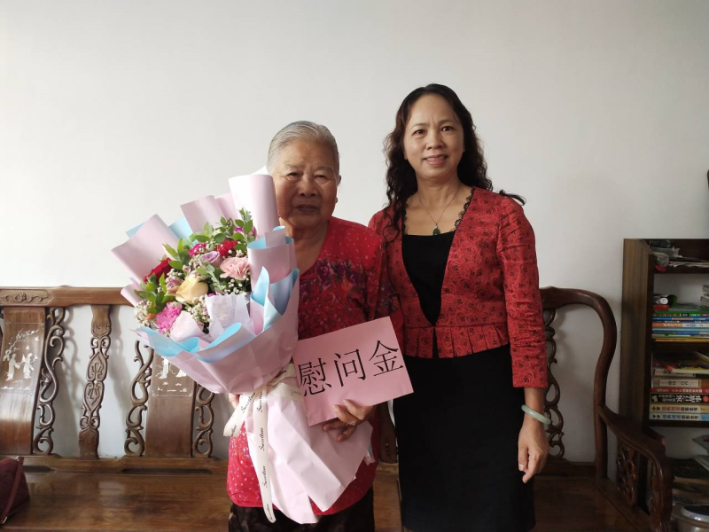 太阳集团2138副校长陈东莲(右)慰问退休教职工梁如霞