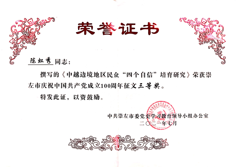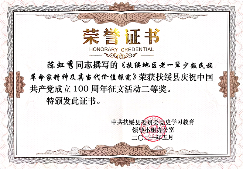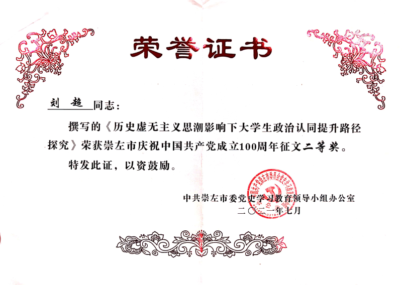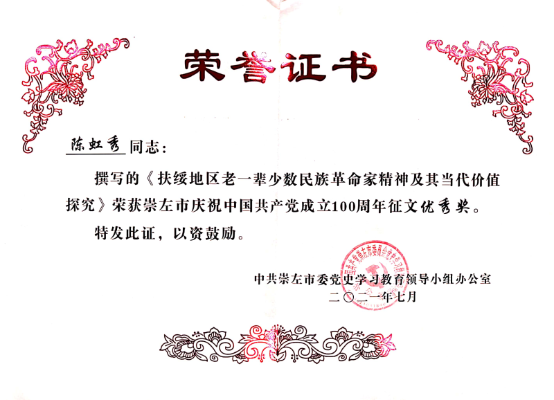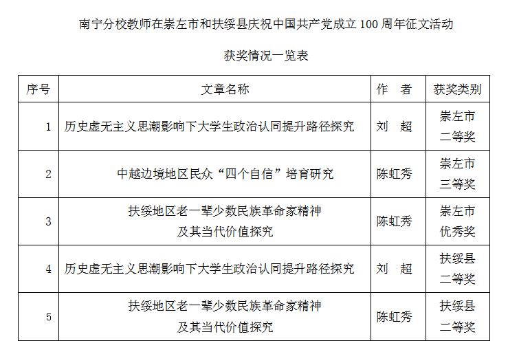 近日,中共崇左市委党史学习教育领导小组办公室和中共扶绥县委党史学习教育领导小组办公室发文通报了庆祝中国共产党成立100周年征文活动评审结果。太阳集团2138教师喜获崇左市二等奖1项、三等奖1项、优秀奖1项,扶绥县二等奖2项。太阳集团2138荣获扶绥县庆祝中国共产党成立100周年征文活动优秀组织奖。