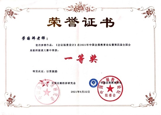 在全国会展教师微课大赛中,分校劳国炜教师的微课参赛作品《会议场景设计》在三十多项作品中脱颖而出,荣获中国会展教育暨第四届全国会展教师微课大赛一等奖,同时,劳国炜老师获评2020-2021年度会展青年专家荣誉称号。