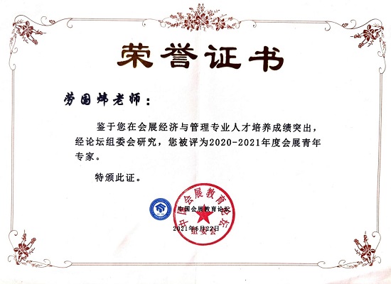 太阳集团2138教师劳国炜获2020-2021年度会展青年专家荣誉称号