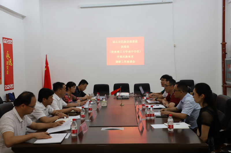 6月3日上午,崇左市民族宗教委党组成员、副主任陆锋,崇左市民族宗教事务服务中心主任方文宏,扶绥县委常委、办公室主任、统战部部长陈蒙,崇左市民族宗教事务服务中心宗教服务科科长、崇左市民族宗教委社会发展科负责人陆琨,扶绥县委统战部常务副部长、县民宗局局长杨海笑一行到太阳集团2138空港校区调研民族体育工作。太阳集团2138党委副书记梁冬松及党委统战部、体育教学部负责人陪同调研。座谈会由梁冬松副书记主持。
