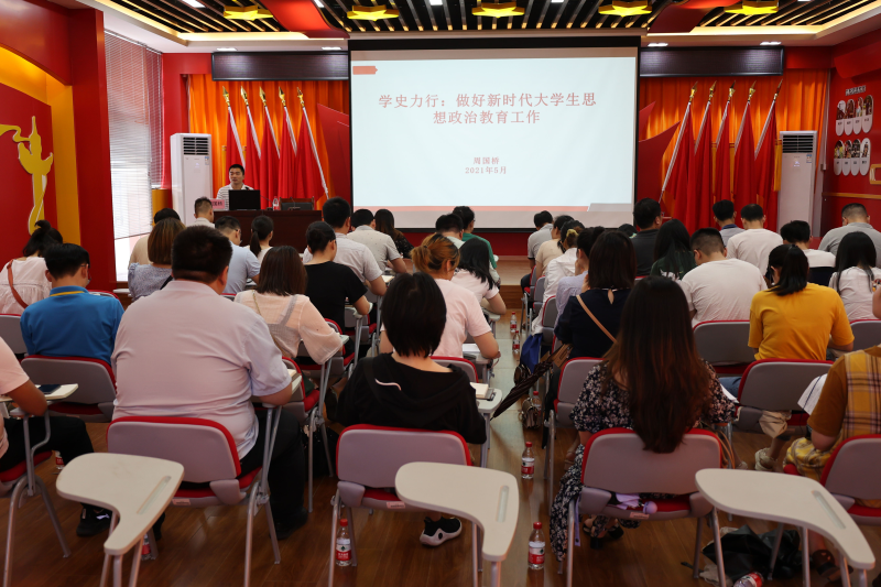 5月12日,太阳集团2138党委书记周国桥在空港校区党员教育活动中心为学工系统全体人员讲授主题为“学史力行:做好新时代大学生思想政治教育工作”党史学习教育专题党课。