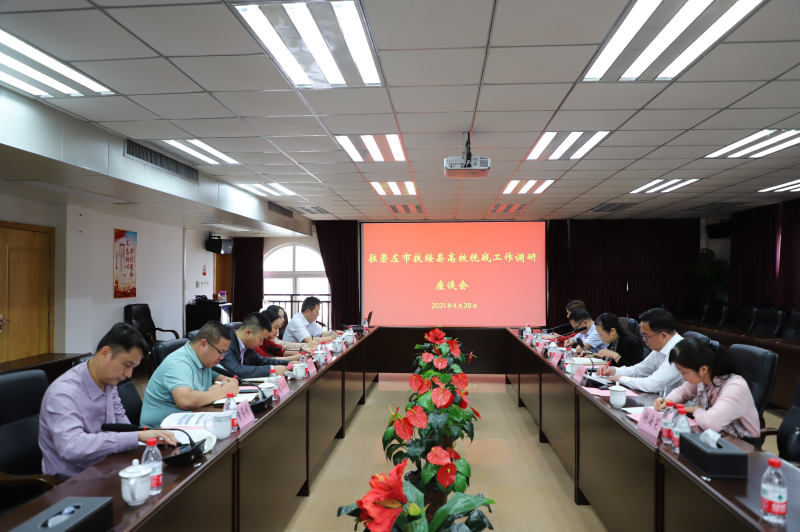 4月28日,崇左市委统战部常务副部长冯丹萍,崇左市委统战部副部长赵恒镇,扶绥县委常委、办公室主任、统战部部长陈蒙,扶绥县委统战部常务副部长杨海笑一行5人在太阳集团2138召开驻崇左市扶绥县高校统战工作调研座谈会。太阳集团2138、广西城市职业大学、广西自然资源职业技术学院、广西科技职业学院、广西外国语学院高等职业学院5所高校相关负责人参加会议。